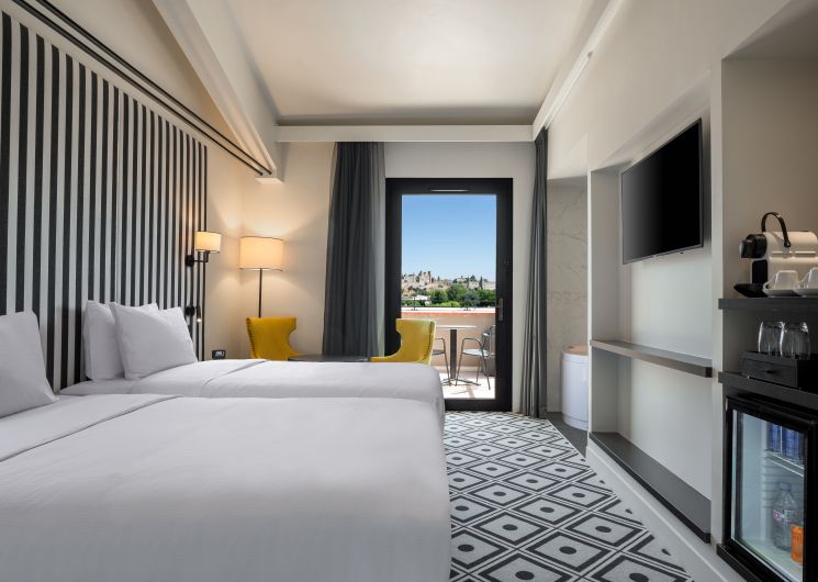L’établissement offre 88 chambres réparties sur 3 étages, dotées d’un grand confort et offrant pour la plupart une vue imprenable sur les remparts. Mise à disposition de 90 chambres supplémentaires à l’Hôtel Les Chevaliers, site mitoyen.