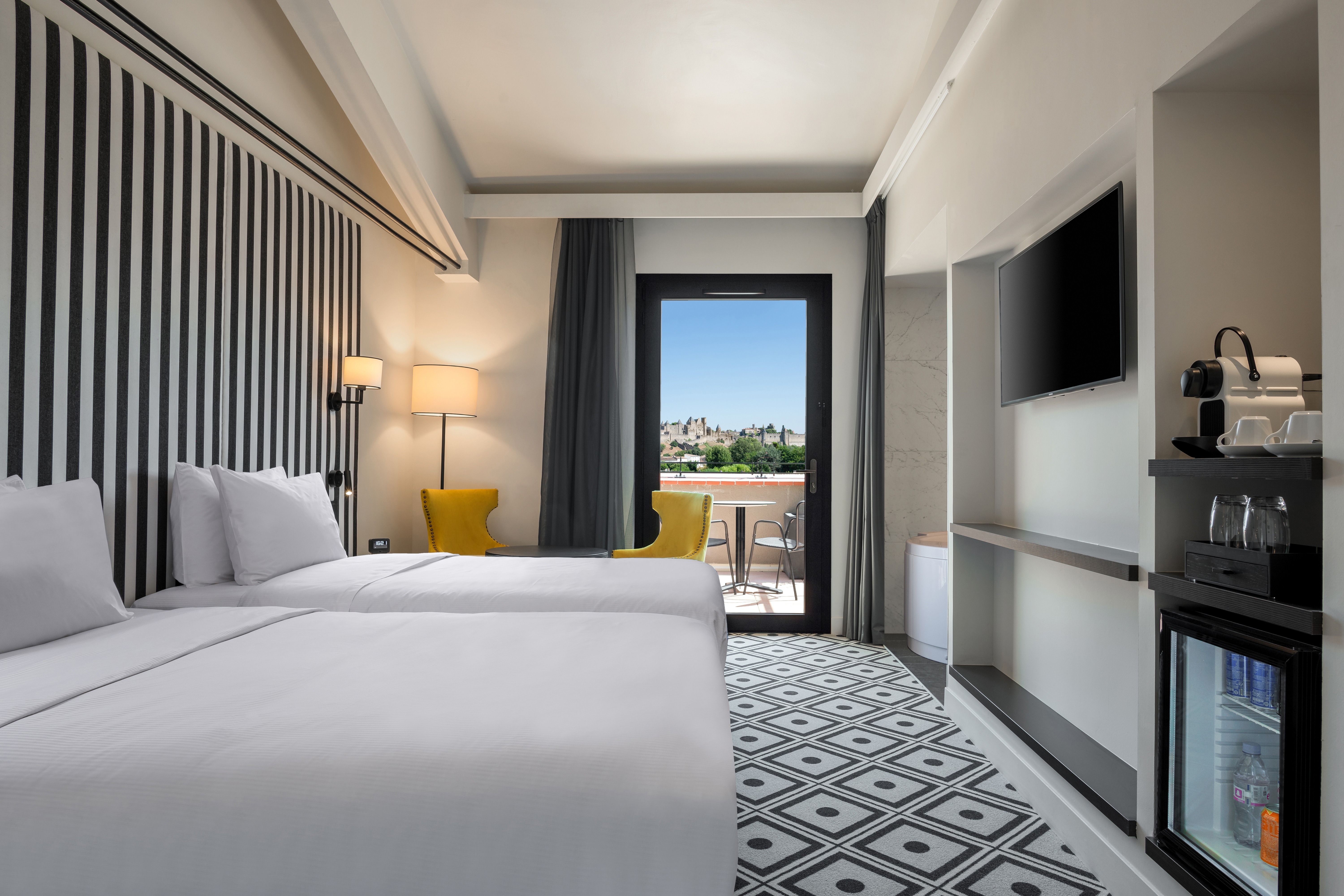 L’établissement offre 88 chambres réparties sur 3 étages, dotées d’un grand confort et offrant pour la plupart une vue imprenable sur les remparts. Mise à disposition de 90 chambres supplémentaires à l’Hôtel Les Chevaliers, site mitoyen.