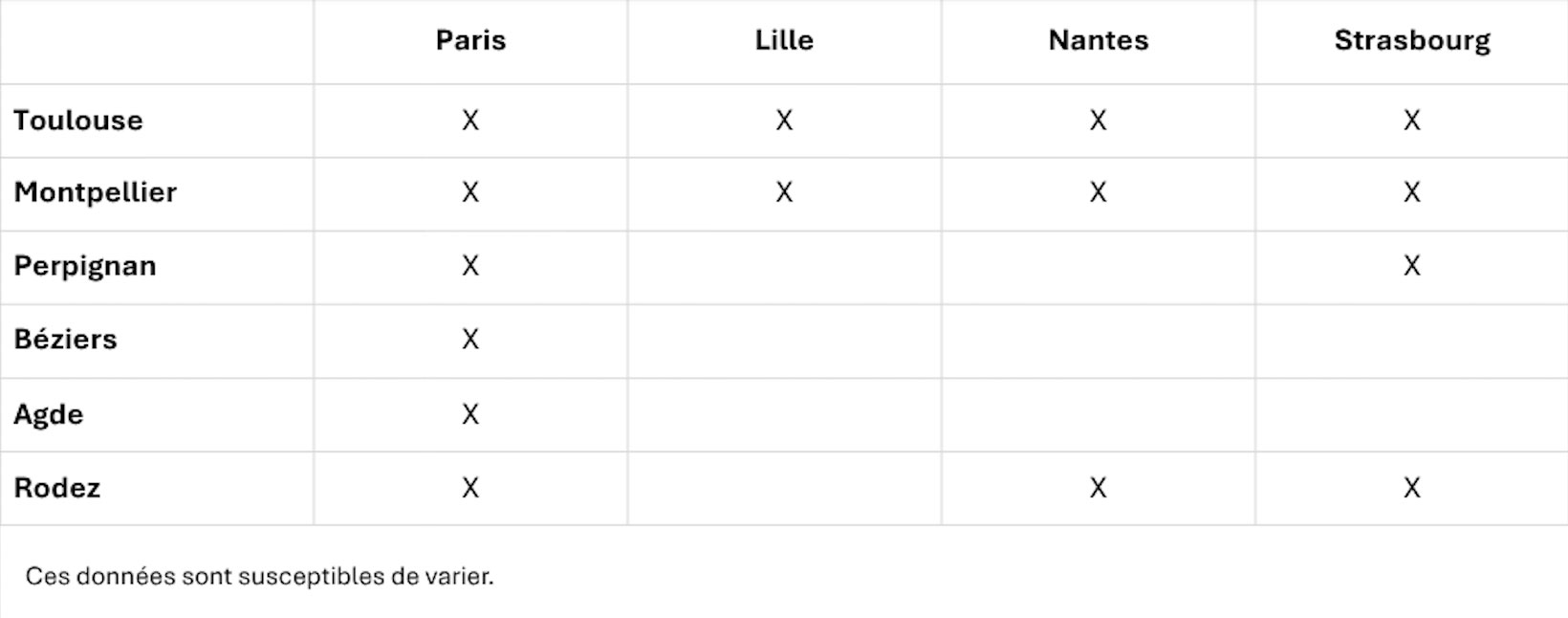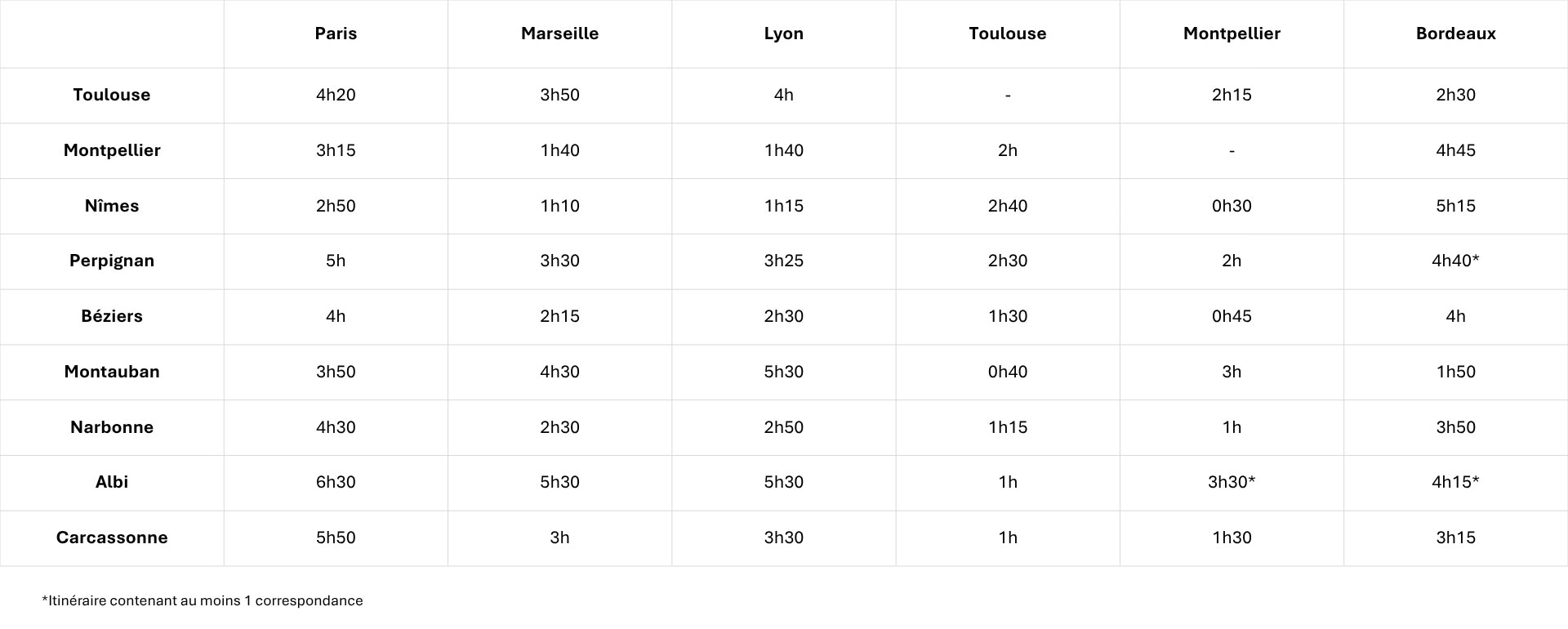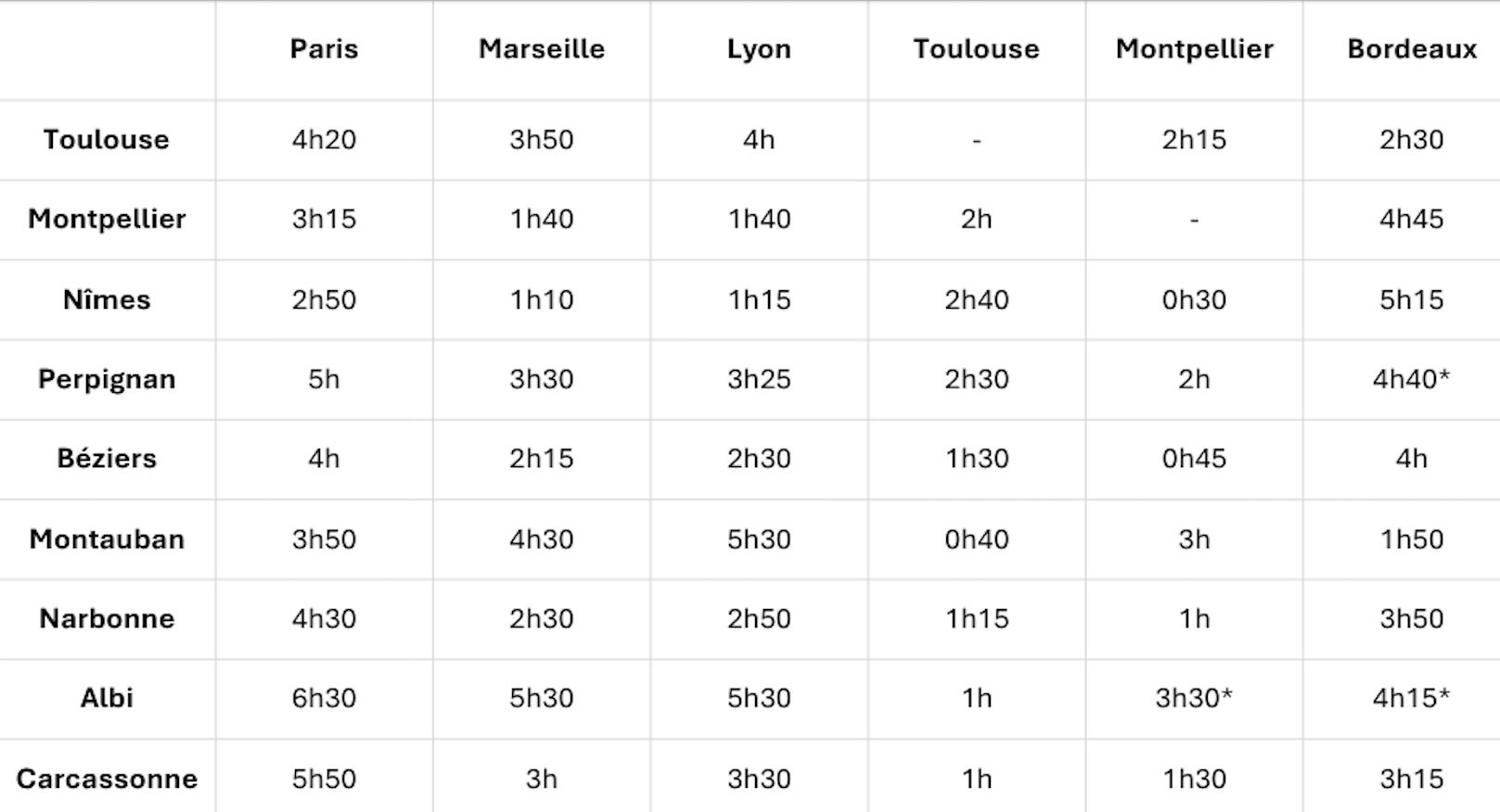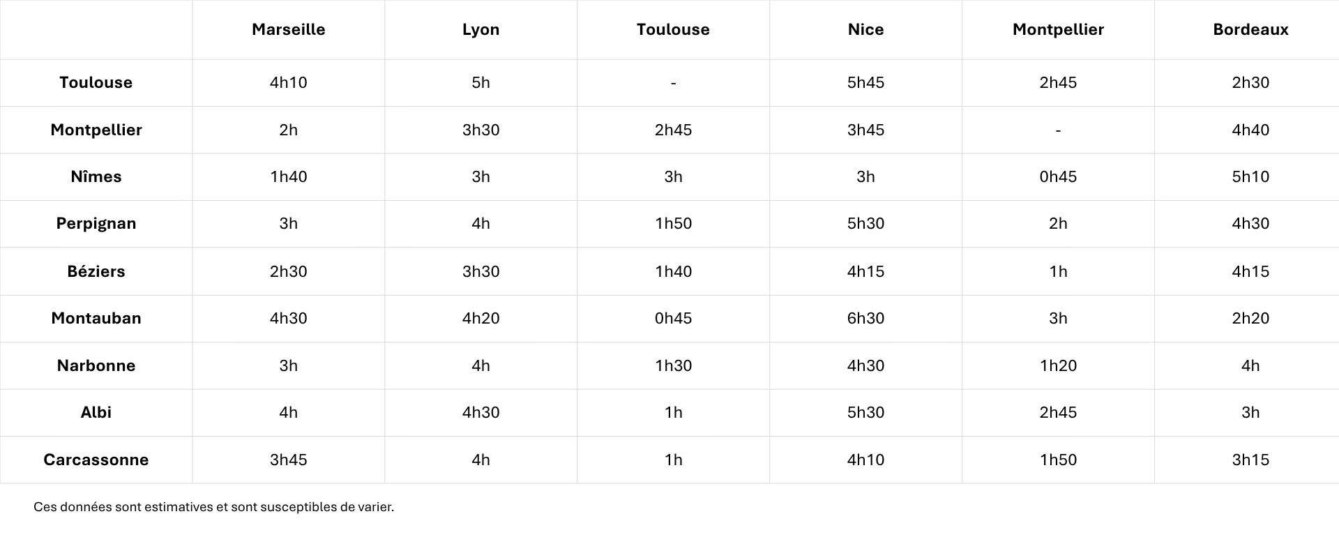 Retrouvez le tableau estimatif des temps de trajet en voiture, que vous vous rendez à Toulouse, Montpellier, Nîmes ou Perpignan.