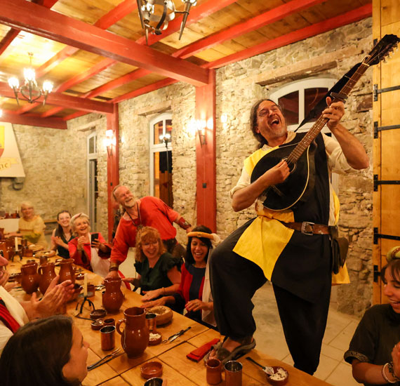 Trois menus historiques sont proposés au choix, adaptés à tous les budgets et à toutes les envies : le Menu Retour de Croisade du Chevalier Godefroy, la Table du Vicomte Trencavel ou le Festin du Roi Louis, avec uniquement des plats authentiques dégustés au Moyen Âge. La décoration médiévale et les animations personnalisables rendent l’expérience exceptionnelle : lavage des mains à l’eau de rose, spectacles de chevaliers ou de troubadours avec participation des convives, possibilité de louer des costumes ou encore une troupe médiévale complète avec danseurs, musiciens et jongleurs. Rires, convivialité et immersion totale garantis pour faire de chaque événement un moment mémorable et unique, qui ravira collaborateurs, clients et partenaires !